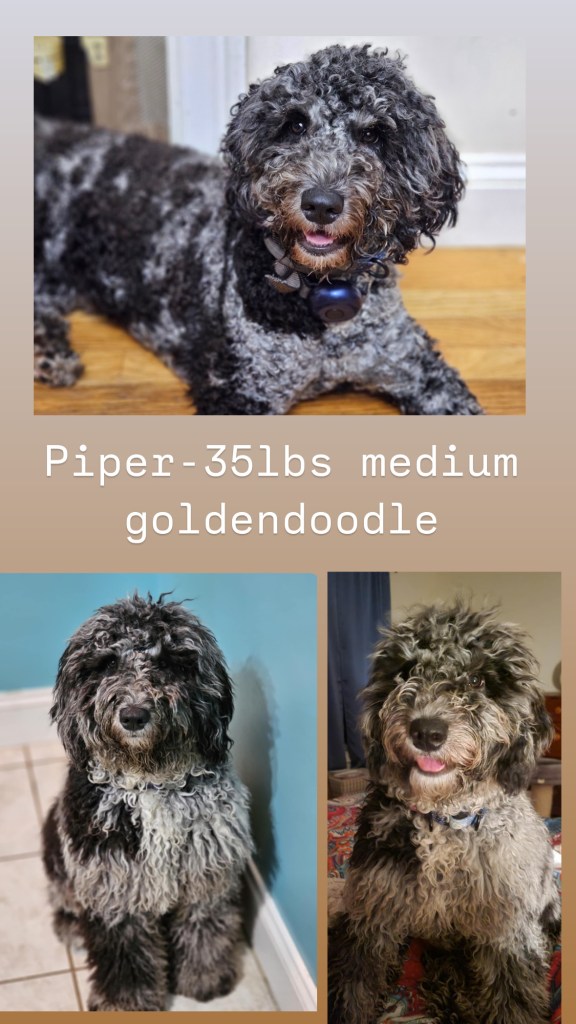 Piper is an F1B (75% poodle, 25% retriever) blue merle mini goldendoodle. She weighs approximately 35lbs, and is such a mush! Piper has completed all of her health and genetic testing. She carries the merle gene, providing the possibility for those adorable multicolored pups!