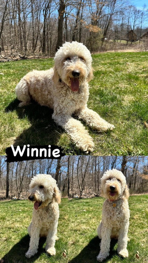 Winnie is an F1 (50/50) cream standard goldendoodle. She weighs approximately 60lbs, and is a gentle giant! Winnie has completed all of her health and genetic testing. She carries a variety of color genes and coat types, giving her litters a wide range of diversity!